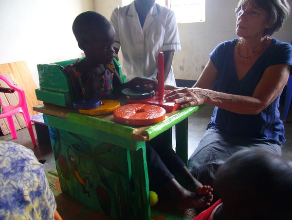 We run 2-week workshops to enable people to make bespoke adaptive equipment for children who need extra physical support and postural management. The equipment is made out of newspaper and cardboard with a flour paste for glue. The equipment is sturdy, can easily be repaired and adapted and can be made comfortable for the child enabling a better access to education. We have run several workshops in Moldova and Uganda with great success! The photo shows a booster seat which enables a child to sit at a bench desk and makes writing easier. The child is then included and integrated into a class.